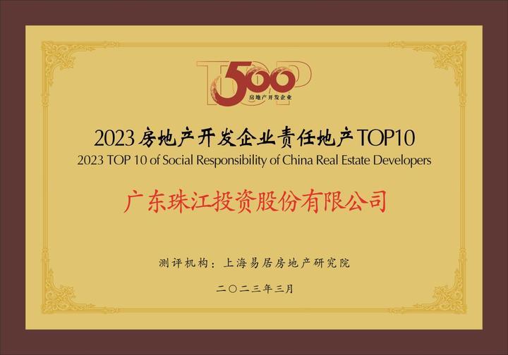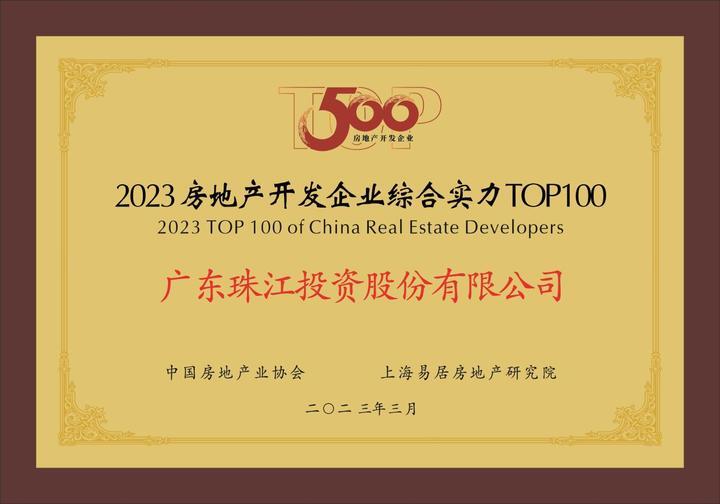 2023年3月23日,中國房地產業協會、上海易居房地產研究院聯合舉辦“2023中國房地產開發企業500強測評成果發布會”。廣東珠江投資股份有限公司憑借其高質量發展和雄厚實力,再次榮膺“2023中國房地產開發企業綜合實力100強”“2023中國房地產開發企業責任地產10強”。其打造的濱海封面標桿項目——廣州·珠江海御,獲評“2023房地產開發企業典型項目”獎項。