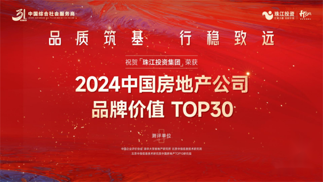 2024年9月,由中國企業評價(jia)協會(hui)、清華大學房(fang)地(di)產研究(jiu)所、北(bei)京中指信(xin)(xin)息技術研究(jiu)院(yuan)主辦,北(bei)京中指信(xin)(xin)息技術研究(jiu)院(yuan)中國房(fang)地(di)產TOP10研究(jiu)組承(cheng)辦的“2024中國房(fang)地(di)產品(pin)牌價(jia)值(zhi)研究(jiu)成果發(fa)布(bu)會(hui)”在雄(xiong)安新區召開(kai)。廣東珠(zhu)江投(tou)資(zi)股(gu)份有限公(gong)司(si)(以下簡稱:珠(zhu)江投(tou)資(zi)集團)堅持“品(pin)質筑基、行穩致遠”,榮膺(ying)“2024中國房(fang)地(di)產公(gong)司(si)品(pin)牌價(jia)值(zhi)TOP 30”。